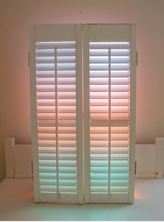 ︎︎︎Sunset ShuttersThe shutters my mom scavenged, and I put them to good use. Behind the shutters is a wooden window frame, softened by opaque white acrylic that hides LEDs that shift sunset colors from the inside.