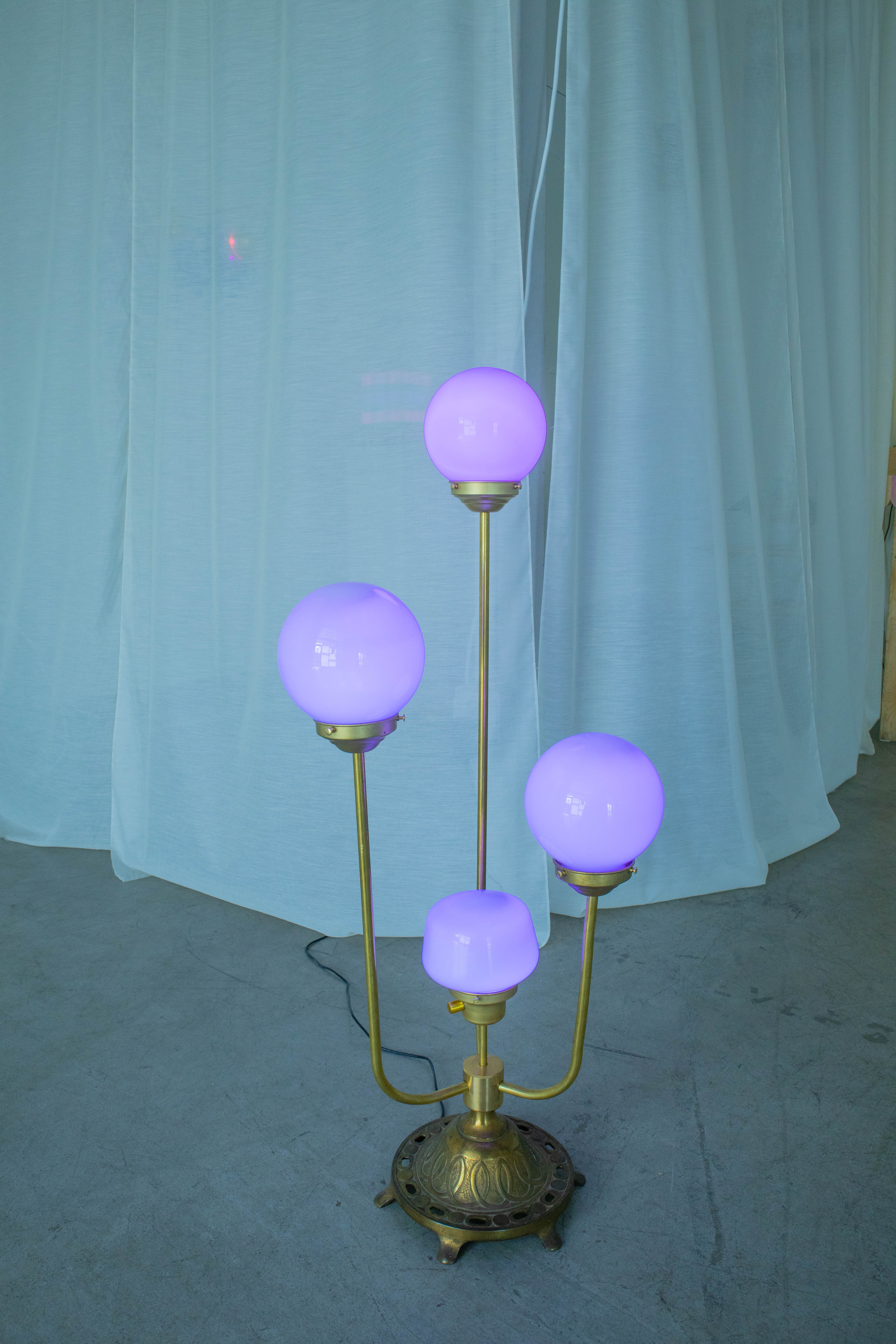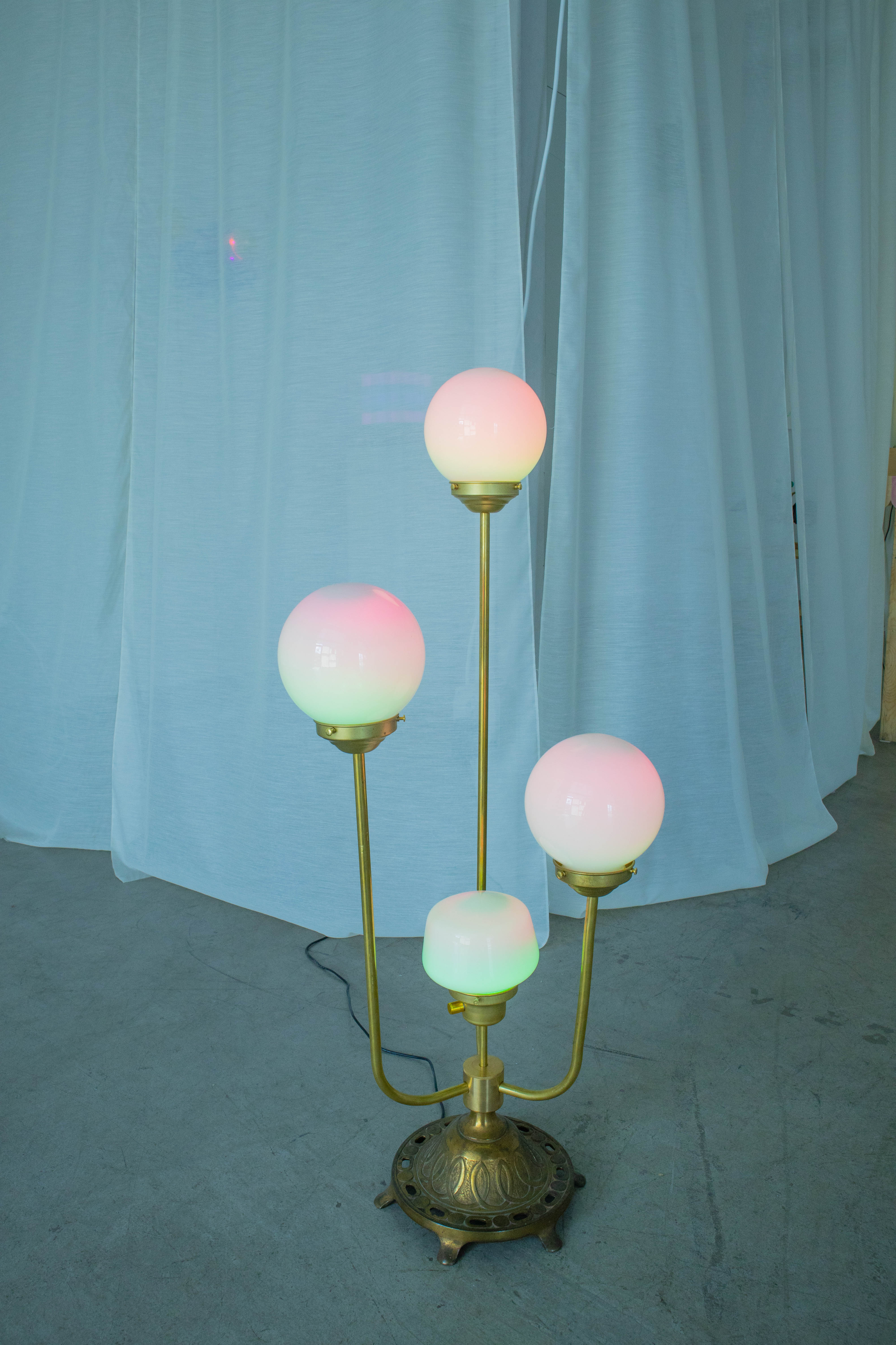 Orb Lamp iterates my ongoing exploration of the shifting hue of flower petals. Many flowers shift from pink and green to purple and blue before they die.